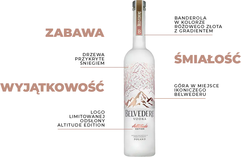 Belvedere Altitude Edition to zimowa odsłona pierwszej na świecie wódki super premium. Zainspirowana widokiem Alp o zachodzie słońca, jej limitowana edycja łączy w sobie energię górskiego zmierzchu w porze „Golden Hour” z luksusowym smakiem migdałów, wanilii i białego pieprzu. Korzystając z sześciusetletniego dziedzictwa polskiej produkcji wódki, Altitude prezentujemy w prestiżowych kurortach alpejskich Francji, Włoch, Szwajcarii i Polski. Design butelki, z alpejskimi szczytami i różowo-złotymi akcentami, to hołd dla piękna gór. Do kolekcji dołącza nowa seria ekscytujących koktajli, z gorącą czekoladą Belvedere i ponczem z przyprawami Altitude.