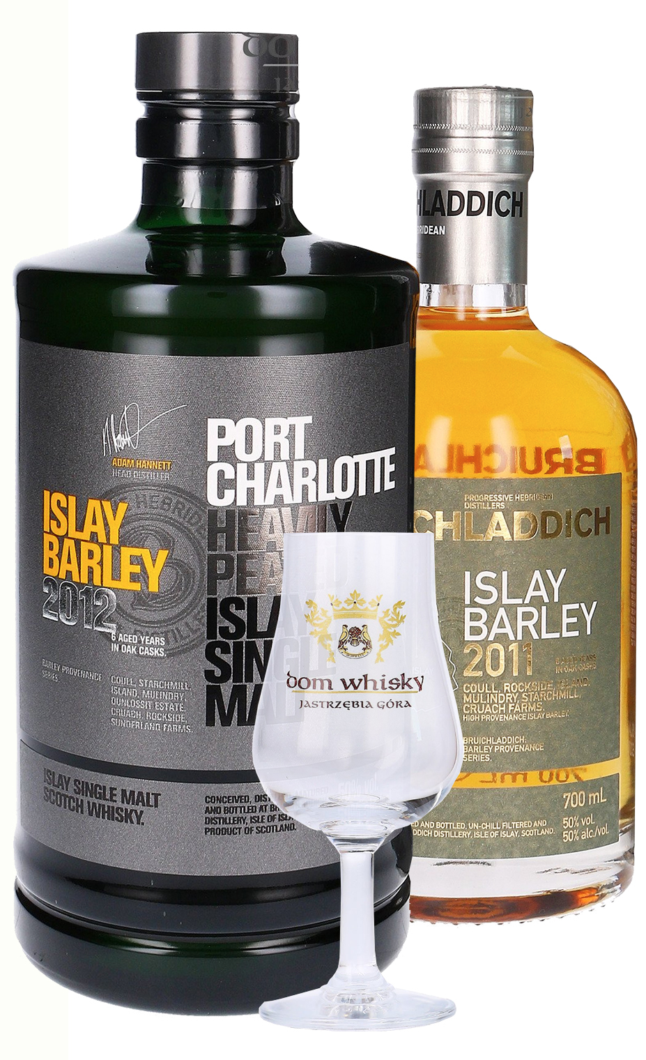* W cenie butelki: Port Charlotte Islay Barley 2012 i Bruichladdich Islay Barley 2011 oraz zestaw 5 sampli degustacyjnych o pojemności 20ml + kieliszek degustacyjny Dom Whisky.