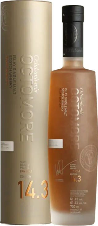 Każdego roku Bruichladdich Distillery wydaje kolejną, limitowaną serię Octomore’a, najbardziej „dymno-torfowej” whisky świata. Edycja czternasta z 2023 roku składała się z trzech odsłon, do których zestawienia mistrz destylacji Adam Hannett wybrał whisky wydestylowane ze słodu o koncentracji związków fenolu od 128,9 do 214ppm. Octomore Edition: 14.3 został wydestylowany w 2017 roku z jęczmienia odmiany Concerto zebranego rok wcześniej z farmy Octomore i słodowanego do poziomu koncentracji związków fenolu 214,2ppm. Whisky starzona była przez pięć lat w beczkach po bourbonie pierwszego napełnienia (50%) oraz w beczkach po winach ponownego napełnienia (50%) i butelkowana z mocą 61,4% abv.