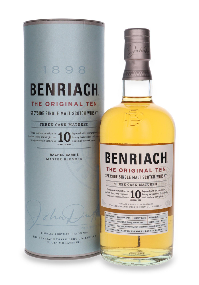 Benriach The Original Ten whisky is distinguished by its rich, multilayered and balanced taste, which is a hallmark of this distillery.Matured for at least ten years in sherry, bourbon, and virgin oak barrels.Thanks in part to this, Benriach The Original Ten is characterized by its multidimensionality, perceptible notes of orchard fruit, honey and toasted oak, combined with the subtle sweetness of barley.This single malt whisky is the perfect introduction to our prized style of complex single malt whisky from the Speyside region.