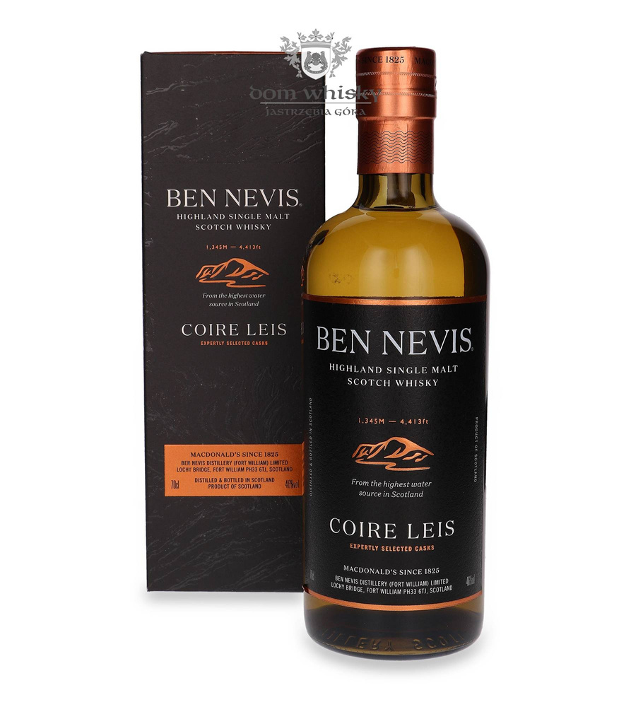Zbudowana w 1825 roku przez Long Johna Macdonalda przez kolejnych 116 lat pozostawała własnością rodziny założycielskiej. Od 1989 roku należy do Nikka Distilling Company i każdego roku lwia część świeżego destylatu trafia do Japonii i po odbytej tam maturacji wykorzystana jest do kupażowania blendów Nikka. Ben Nevis Coire Leis debiutował jesienią 2021 roku i nosi nazwę źródła wody destylarni, leżącego na zboczu góry, powyżej destylarni. Whisky pochodzi wyłącznie z beczek po bourbonie, głównie pierwszego napełnienia, i butelkowana jest z naturalną barwą, bez filtracji na zimno i bez oznaczenia wiekowego (nieoficjalnie słyszeliśmy, iż w edycji wykorzystano destylaty 6-8 letnie).